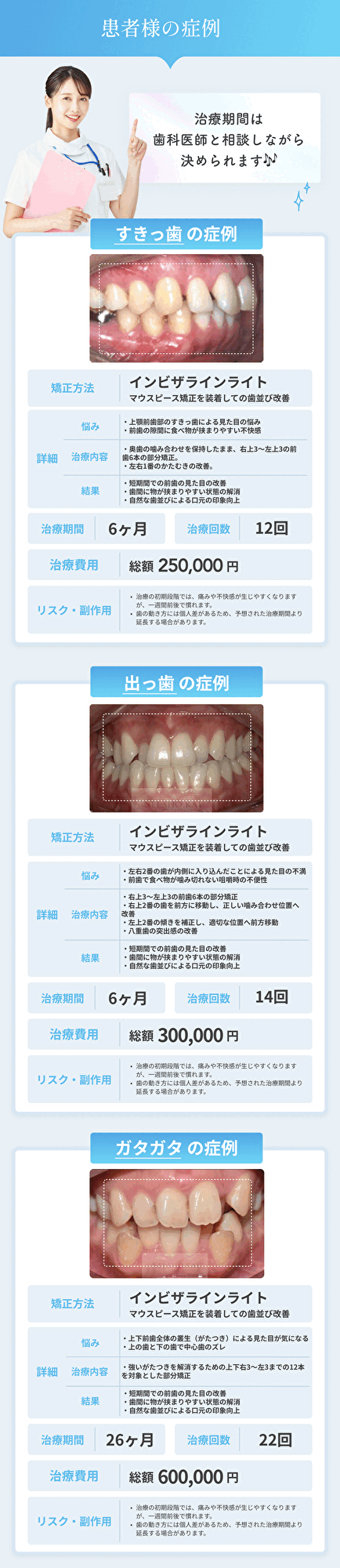 歯並びにお悩みがある方には矯正治療、歯を取り戻したい方にはインプラントや入れ歯など、患者様ご要望にあわせてお口全体を総合的美しくするお手伝いしていますので、是非お気軽にご予約ください。 - Q マウスピースは本当に目立ちませんか?